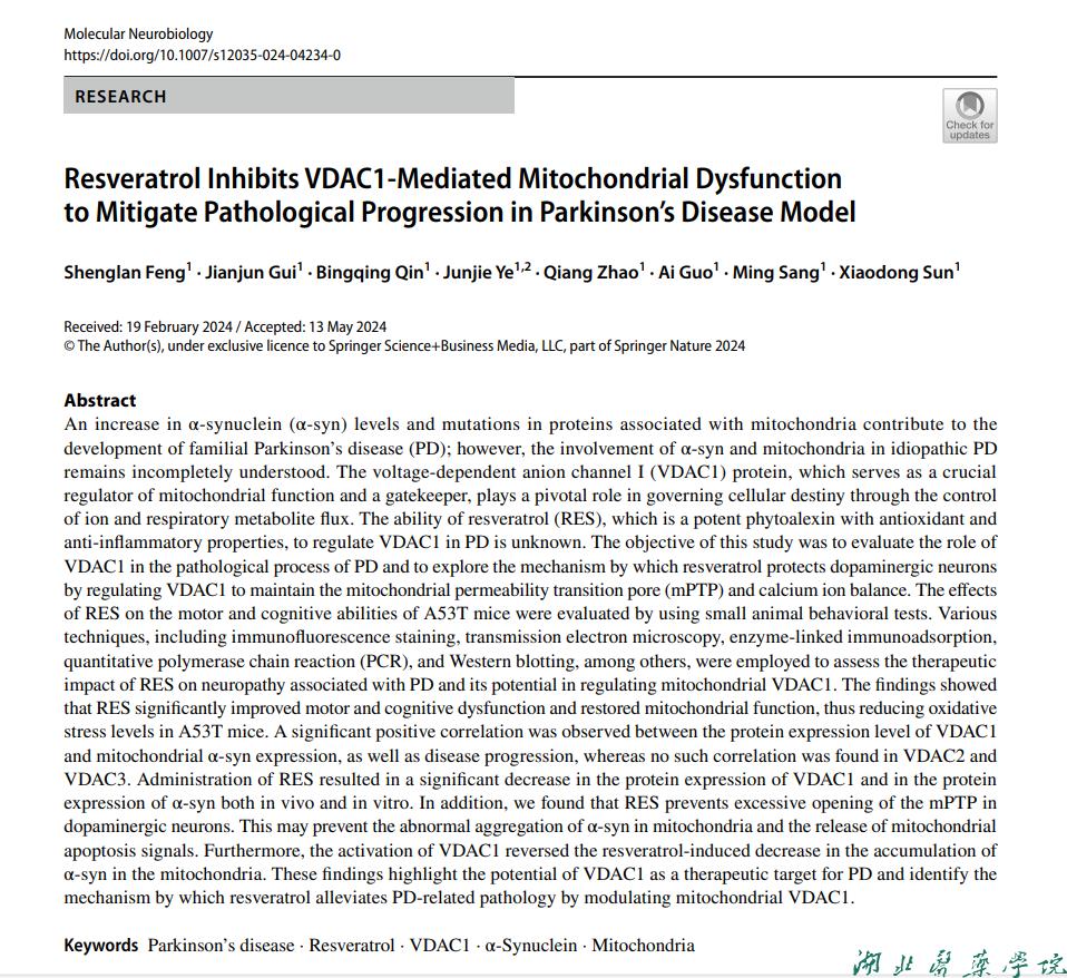 本网讯(通讯员 胡鸿)6月1日,2138cc太阳集团2020级临床检验诊断学硕士研究生冯胜蓝攻读硕士期间的研究成果在《Molecular Neurobiology》期刊上发表,研究论文题目为《Resveratrol Inhibits VDAC1‑Mediated Mitochondrial DysfunctiontoMitigate Pathological Progression in Parkinson’s Disease Model》,该期刊2024年影响因子5.1,中科院2区。