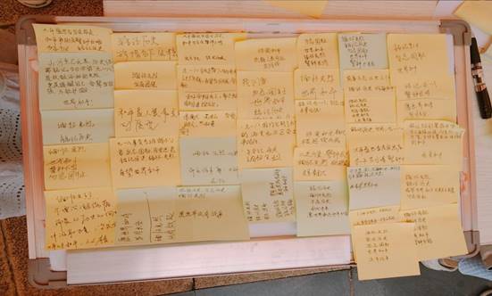 活动现场设置两大核心区域,氛围庄重而热烈。在“心声留言区”,一张张便利贴成为情感表达的载体。学生们提笔书写,将对历史的敬畏、对和平的珍惜、对祖国的祝福落于纸上:“不忘国耻,吾辈自强”“用青春力量守护盛世中华”……短短数语饱含深情,贴满墙面的便利贴汇聚成一片“爱国心声墙”,成为现场最亮眼的红色风景。