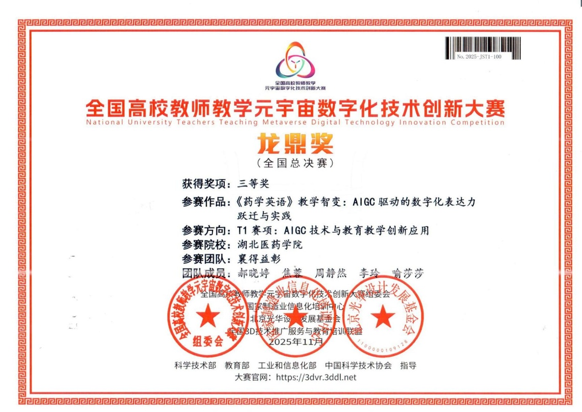 本网讯(通讯员 郝晓婷)近日,由科技部、教育部、工业和信息化部及中国科学技术协会指导,全国高校教师教学元宇宙数字化技术创新大赛组委会主办的第6届全国高校教师教学元宇宙数字化技术创新大赛(全国3D教师大赛)总决赛中,2138CC太阳集团“襄得益彰”教师团队凭借作品《〈药学英语〉教学智变:AIGC驱动的数字化表达力跃迁与实践》脱颖而出,荣获三等奖。