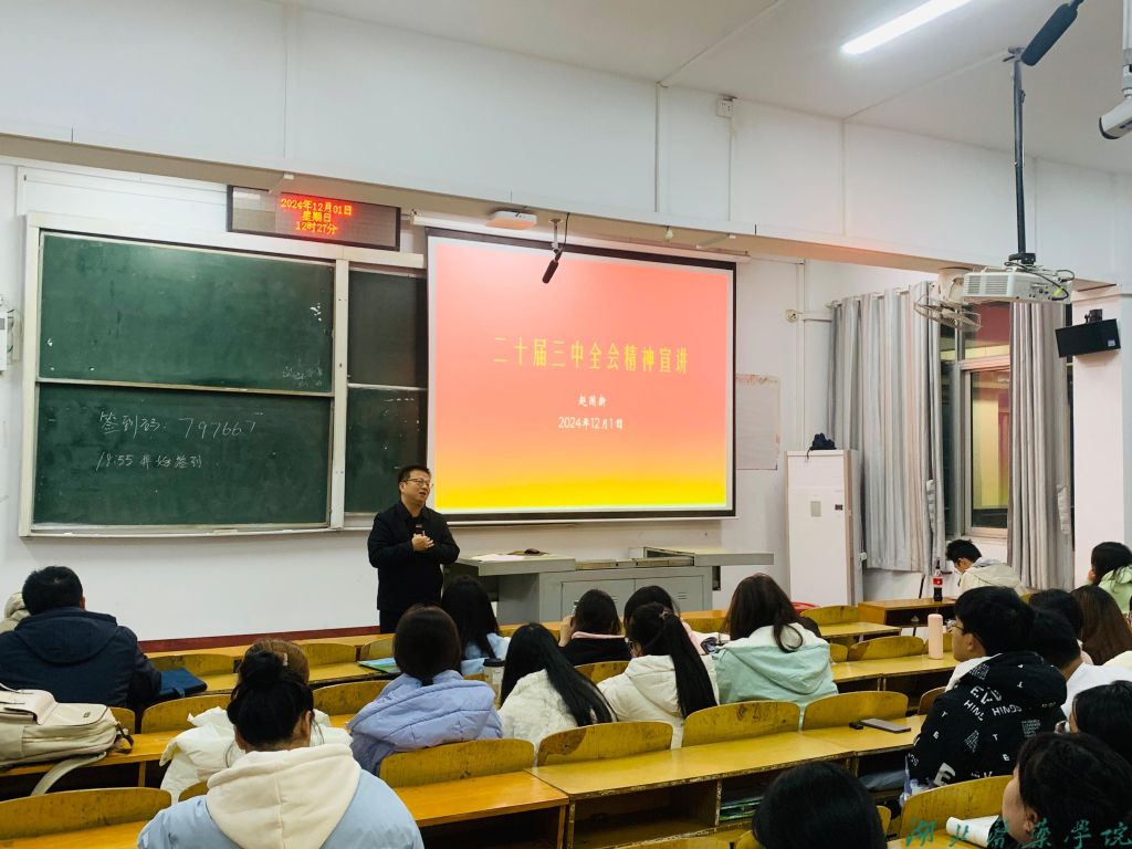 本网讯(通讯员 黄兆辉)为深入贯彻党的二十届三中全会精神,进一步落实立德树人根本任务,全面提升人才培养质量。12月1日18时,学院党委书记赵国新为2024级临床医学专业学生宣讲党的二十届三中全会精神。